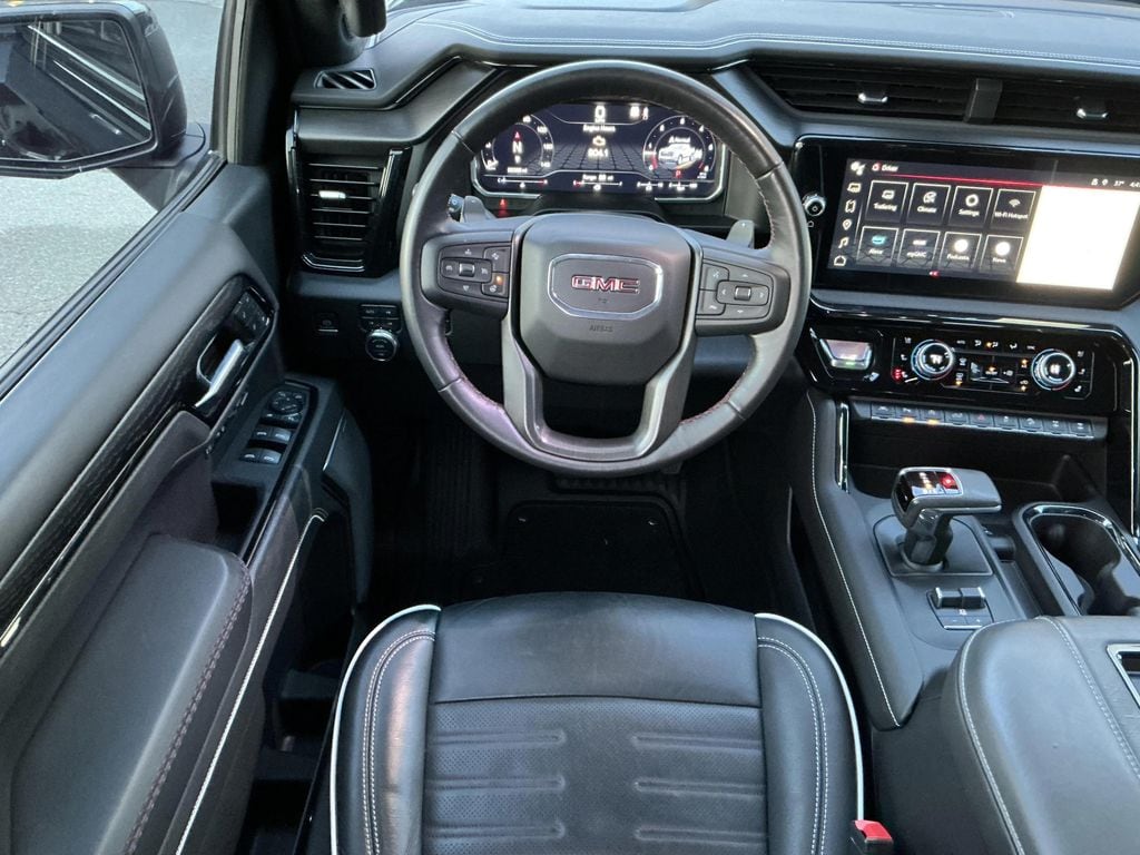 Onyx Black 2022 GMC Sierra 1500 AT4X 4WD 10-Speed Automatic EcoTec3 6.2L V8 10-Speed Automatic, 4WD, Obsidian Rush w/Full Grain Leather Seat Trim, 120-Volt Bed Mounted Power Outlet, 120-Volt Instrument Panel Power Outlet, 2 Charge/Data USB Ports Inside Center Console, 2 Type-C Charge-Only Rear USB Ports, 2 USB Ports, Apple CarPlay/Android Auto, Bed View Camera, Bose Premium Series w/12-Speaker System, Color-Keyed Carpeting Floor Covering, Compass, Dark Nickel Header & Grille Insert Bars, Deep-Tinted Glass, Driver-Selectable Full-Locking Front Differential, Driver-Selectable Full-Locking Rear Differential, Electric Rear-Window Defogger, Electrical Steering Column Lock, Floor-Mounted Center Console, Front Prem Floor Liners w/Removable Carpet Insert, Front Rainsensing Wipers, GMC Connected Access Capable, HD Surround Vision, Heated 2nd Row Outboard Seats, Heated Driver & Front Outboard Passenger Seating, Heavy-Duty Air Filter, Hill Descent Control, Hitch Guidance, Hitch Guidance w/Hitch View, In-Vehicle Trailering App, Integrated Trailer Brake Controller, Keyless Open & Start, LED Cargo Area Lighting, Multicolor 15" Diagonal Head-Up Display, MultiPro Audio System by Kicker (LPO), OnStar & GMC Connected Services Capable, Perimeter Lighting, Power Door Locks, Power Front Passenger Windows w/Express Up/Down, Power Front Windows w/Driver Express Up/Down, Power Rake & Telescoping Steering Column, Power Rear Windows w/Express Down, Power Sliding Rear Window w/Rear Defogger, Power Sunroof, Preferred Equipment Group 4SG, Push Button Start, Rear Cross Traffic Braking, Rear Pedestrian Detection, Rear Prem Floor Liners w/Removable Carpet Insert, Rear Wheelhouse Liners, Red Recovery Hooks, Remote Vehicle Starter System, SiriusXM w/360L, Spray-On Pickup Bed Liner w/AT4X Logo, Steering Wheel Audio Controls, Theft Deterrent System (Unauthorized Entry), Trailer Camera Provisions, Trailer Side Blind Zone Alert, Trailer Tire Pressure Monitor System, Trailering Package, Ultrasonic Front & Rear Park Assist, Universal Home Remote, Ventilated Driver & Front Passenger Seats, Wi-Fi Hotspot Capable, Wireless Charging, Wireless Phone Projection.
